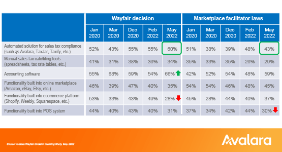 Fewer businesses are using technology to comply with marketplace facilitator laws. Only 43% of survey respondents said they use an automated sales tax solution like Avalara for marketplace facilitator compliance issues, and only 59% of respondents said they use accounting software. The percentage of businesses relying on functionality built in their POS systems to comply with marketplace facilitator laws is at an all-time low, at 30%.