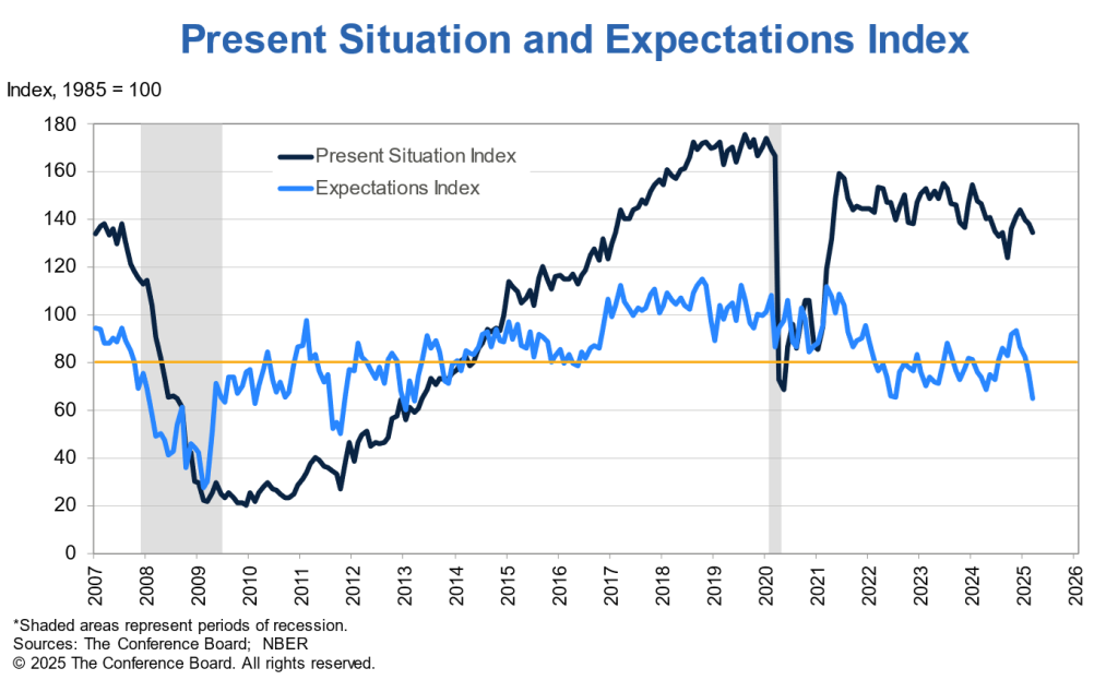 The Conference Board Consumer Confidence Index fell by 7.2 points in March to 92.9 (1985=100). The Present Situation Index—based on consumers’ assessment of current business and labor market conditions—decreased 3.6 points to 134.5. The Expectations Index—based on consumers’ short-term outlook for income, business, and labor market conditions—dropped 9.6 points to 65.2, the lowest level in 12 years and well below the threshold of 80 that usually signals a recession ahead.