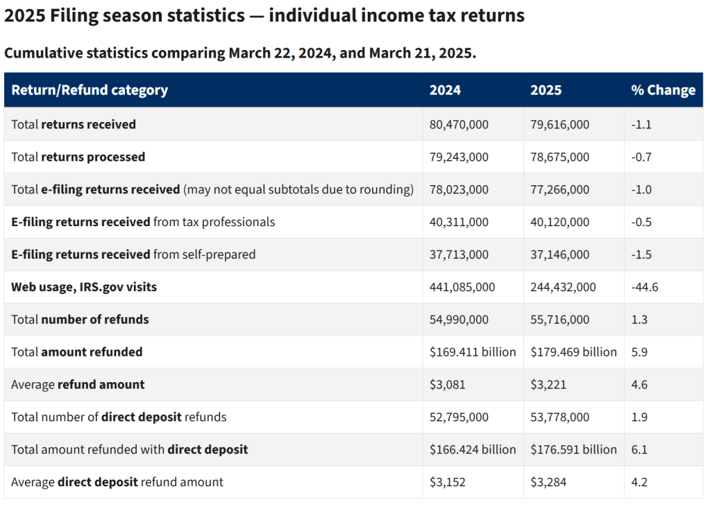The total number of tax returns the agency has received is down 1.1% from this time last year—80,470,000 in 2024 versus 79,616,000 in 2025. But that number is expected to rise in the next couple of weeks leading up to the April 15 federal tax filing deadline. The IRS said before the 2025 tax season began on Jan. 27 that it expects more than 140 million individual tax returns to be filed by the deadline.